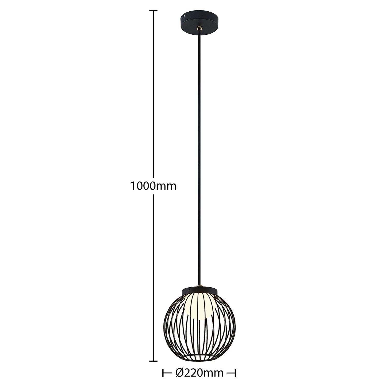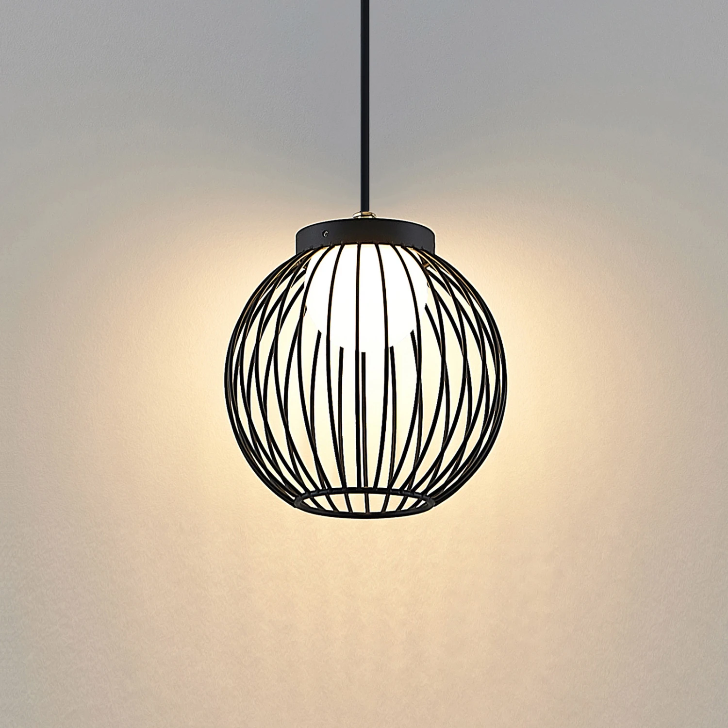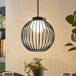 Die LED-Hängeleuchte Kartivan besitzt zwei Schirme. Der äußere Schirm ist wie ein kugelförmiger Käfig aus vielen Metallstreben gestaltet, während der innere Schirm aus weißem Polycarbonat besteht und ähnlich wie ein Diffusor wirkt. Der Innenschirm schützt die Brennstelle und sorgt für eine blendfreie und gleichmäßige Lichtabstrahlung in alle Richtungen. Mithilfe der guten Schutzart kann diese Pendelleuchte auch langfristig im Außenbereich dienen. Dabei wirkt das warmweiße Licht sehr angenehm und lädt zu gemütlichen Stunden auf der Terrasse ein.
