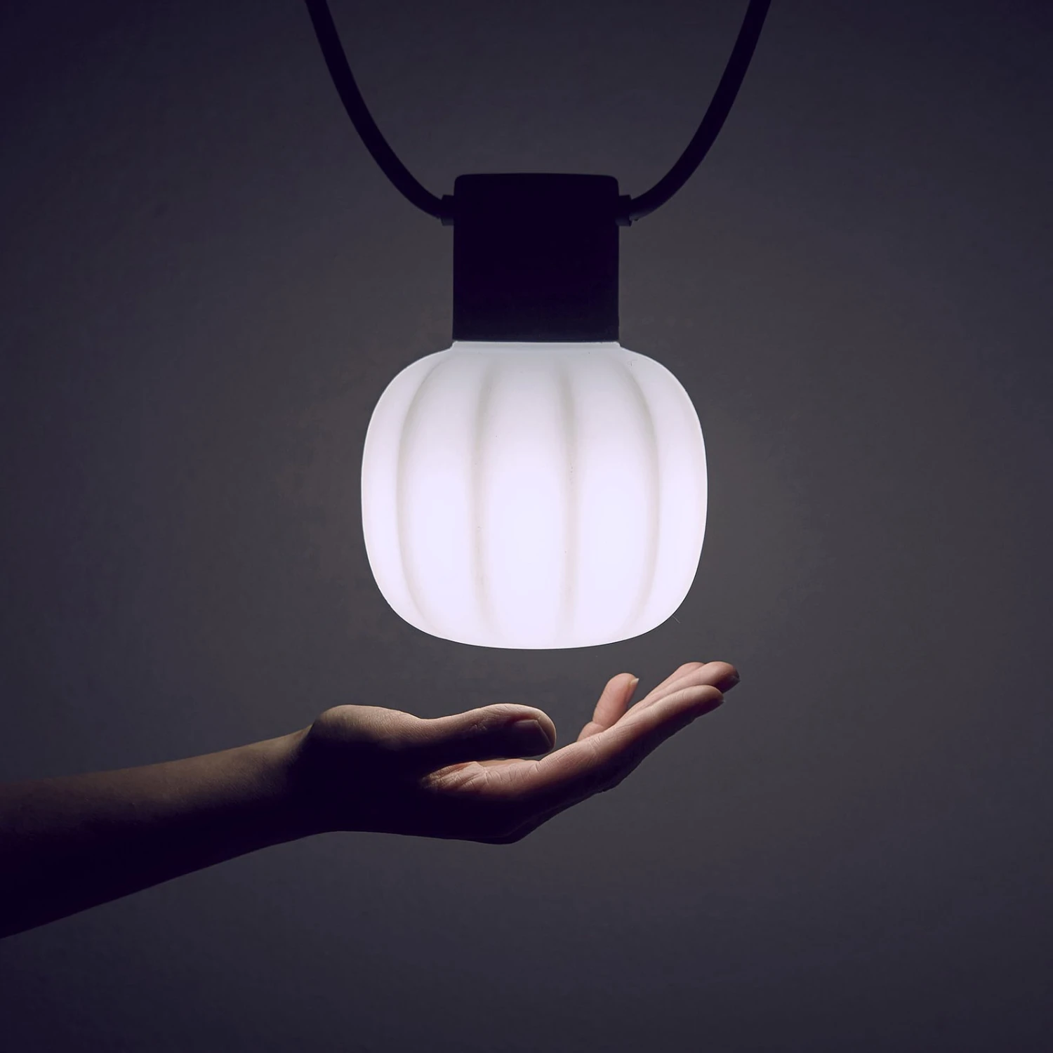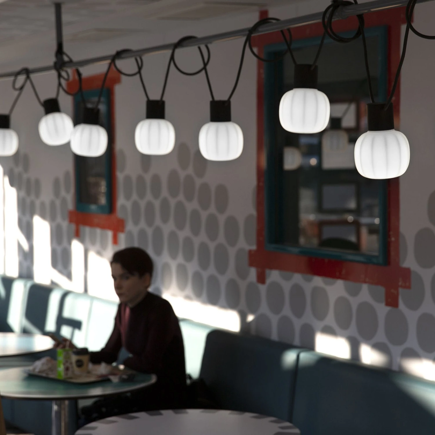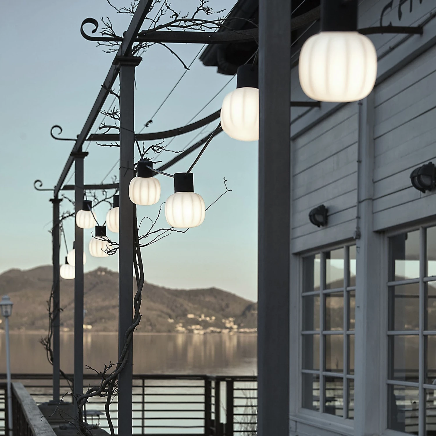 Die Lichterkette Kiki ist eine moderne Option zur Dekoration von Pergolen, Terrassen, Pavillons oder Bäumen. Ihre zehn Schirme sind aus opalem Polyethylen gefertigt und nehmen je eine E27-LED-Lampe auf. Die zylindrischen Halterungen aus Gießharz, an denen die Schirme angebracht sind, dienen zur Einführung des Kabels. Letzteres kann zur Befestigung der Lichterkette über andere Objekte geschwungen werden und bietet an den Endpunkten je einen Haken zu Arretierung.
