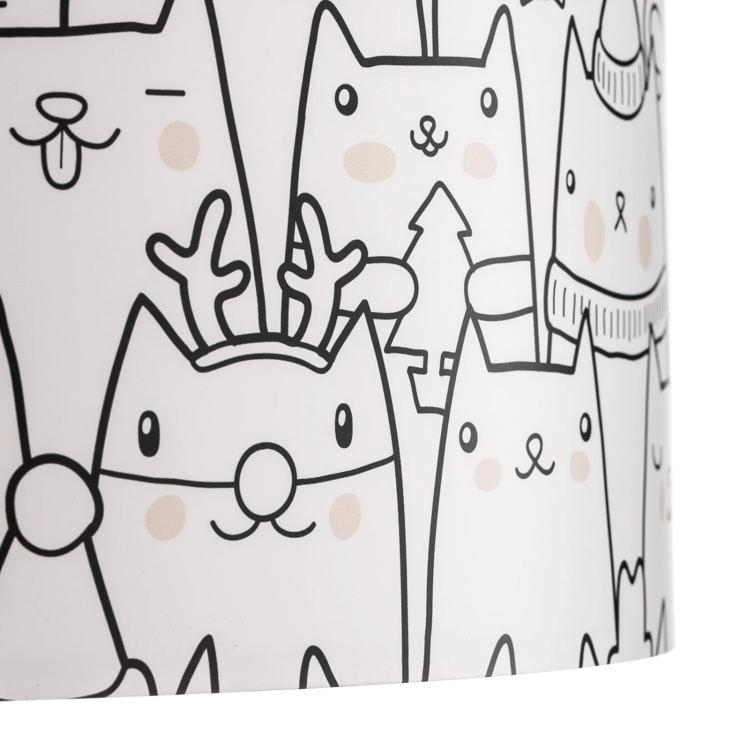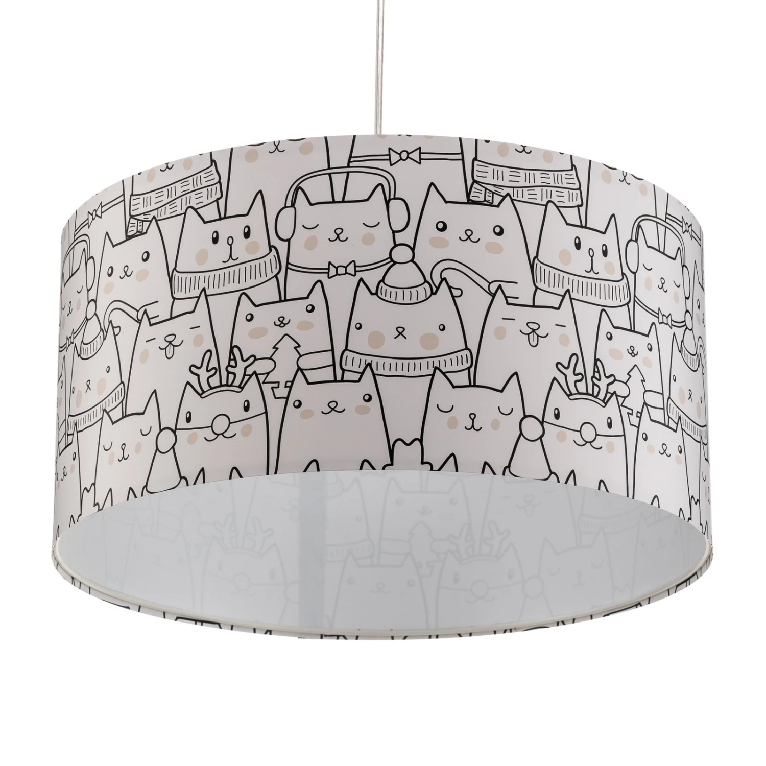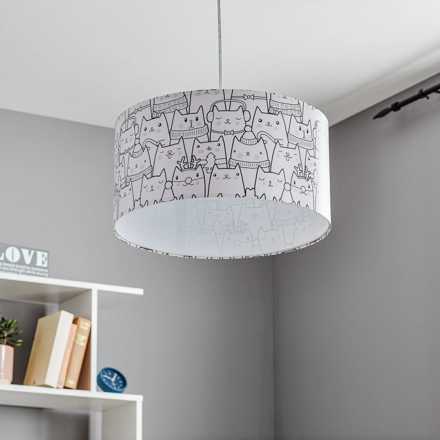 Die moderne Hängeleuchte Cats ist speziell für kleine Katzenliebhaber geeignet. Sie ist mit vielen lustigen Kätzchen versehen, die mit verschiedenen Gesichtsausdrücken ins Zimmer schauen. Dabei wurden lediglich die Konturen der possierlichen kleinen Freunde schwarz gedruckt, der Rest des Schirms ist hell belassen, wodurch die Hängelampe ein freundliches, aber stilvolles Ambiente schafft. Aufgrund der Farbgebung in Schwarz und Weiß passt die Hängeleuchte Cats in jedes Kinderzimmer, ganz gleich wie dieses farblich gestaltet ist. Die Kinderzimmerleuchte bringt eine großzügige Beleuchtung, die zum Spielen bestens geeignet ist.