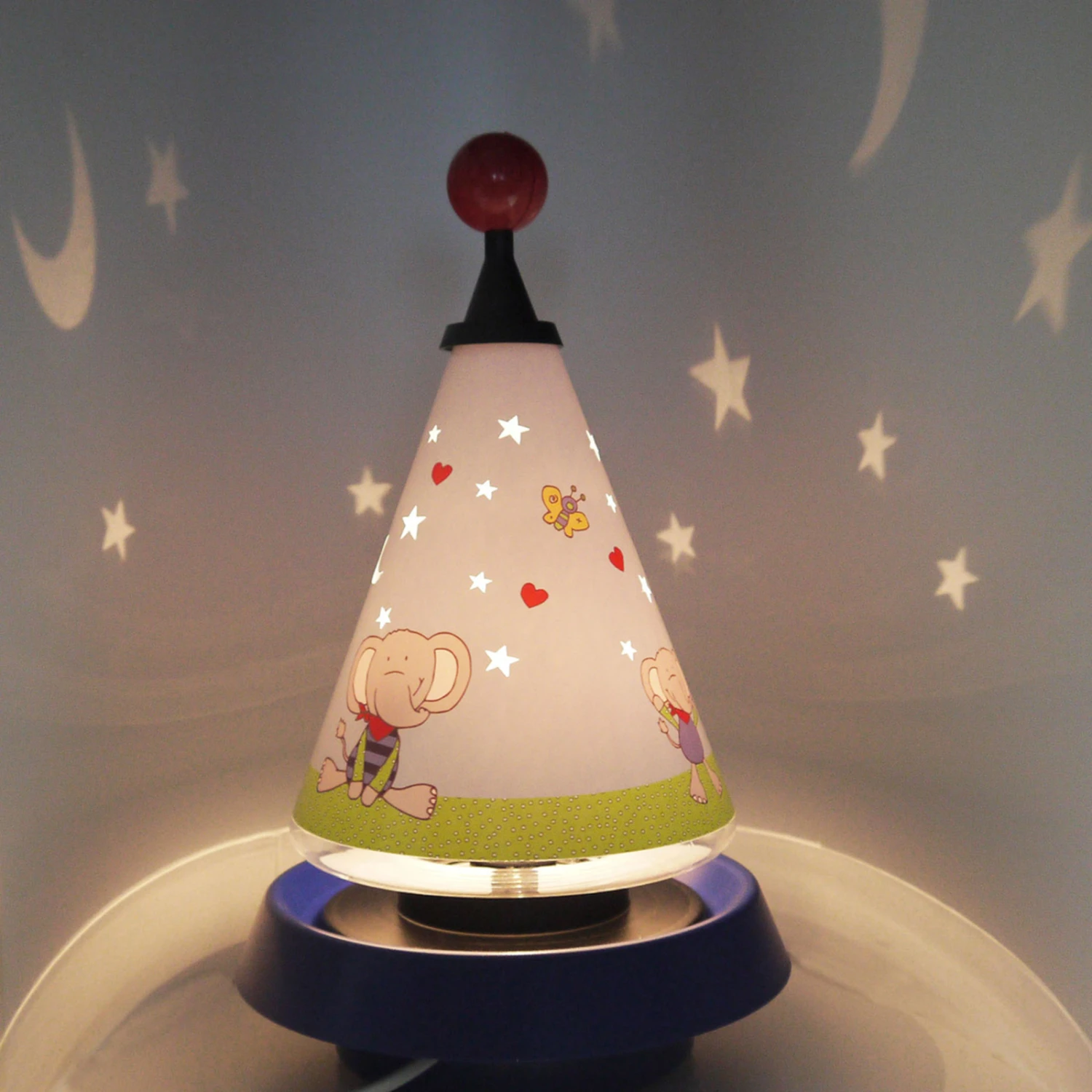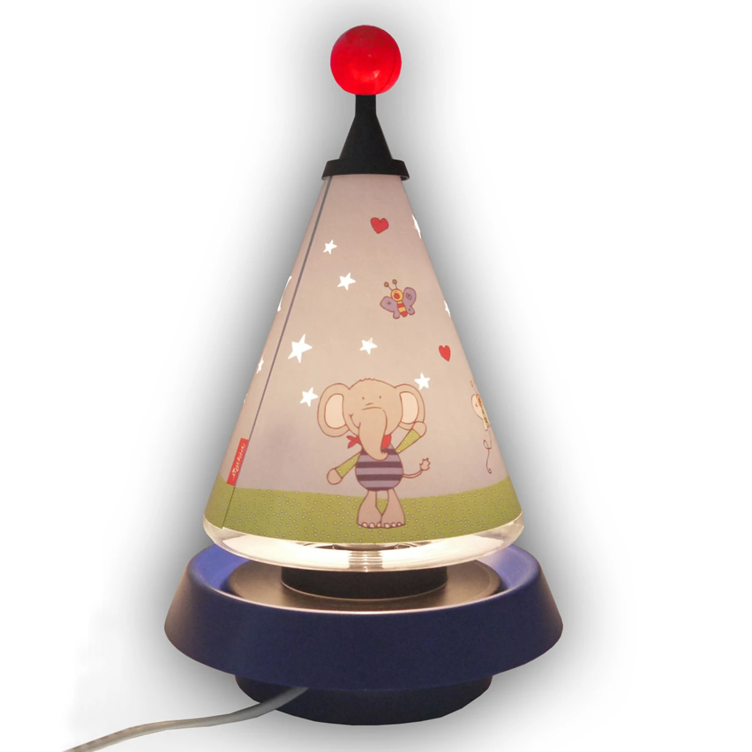 Eine tolle Dekoration im Kinderzimmer ist die Tischleuchte Lolo Lombardo, und zwar sowohl am Tag als auch in der Dunkelheit. Der Schirm der Tischleuchte rotiert dank eines leisen Motors und durch das Licht werden Sterne ringsum an Wände, Möbel und Decke projiziert. Die Tischleuchte wird über den in der Zuleitung integrierten Zwischenschalter ein- und ausgeschaltet und ist mit einem Steckertrafo ausgestattet.