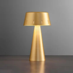 Die Gehäuse der LED-Tischleuchte Makà besteht vollständig aus Eisen und wurde in einem absolut zeitlosen Design von Marc Sadler entworfen. Der Fuß ist als hoher, schlanker Kegelstumpf geformt; der Kopf entspricht dieser geometrischen Form in breiter, flacher Interpretation. Dank der Ausstattung mit einem wiederaufladbaren Akku (Lieferung inkl. USB-Ladekabel) lässt sich die Leuchte überall im Innenbereich nutzen. Mit ihrer geringen Größe eignet sie sich zur Einrichtung und Beleuchtung von Tischen in Restaurants der im privaten Wohnbereich. Unter dem Leuchtenkopf der Tischleuchte ist ein Knopf zum Schalten und dimmen verbaut, wobei sich dank der dim-to-warm-Funktion mit dem Dimmen die Farbtemperatur reduziert.