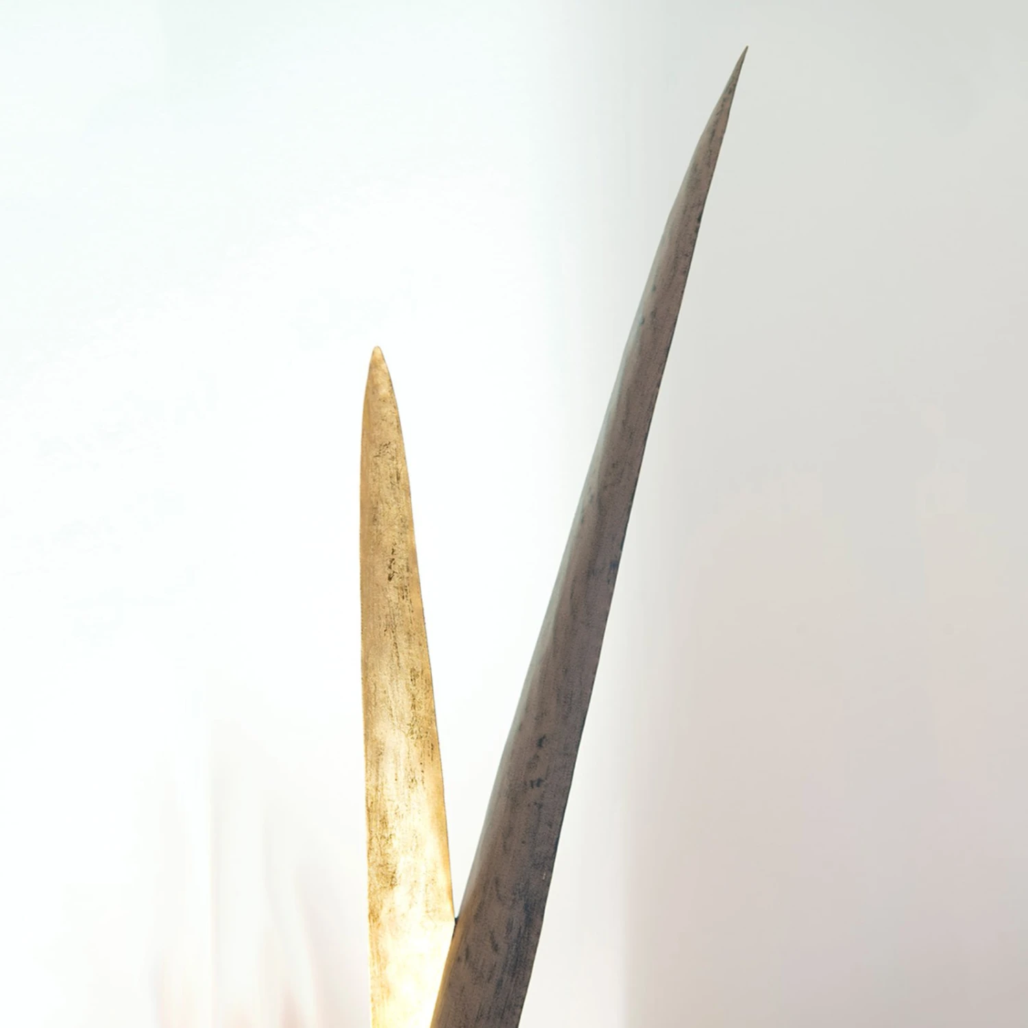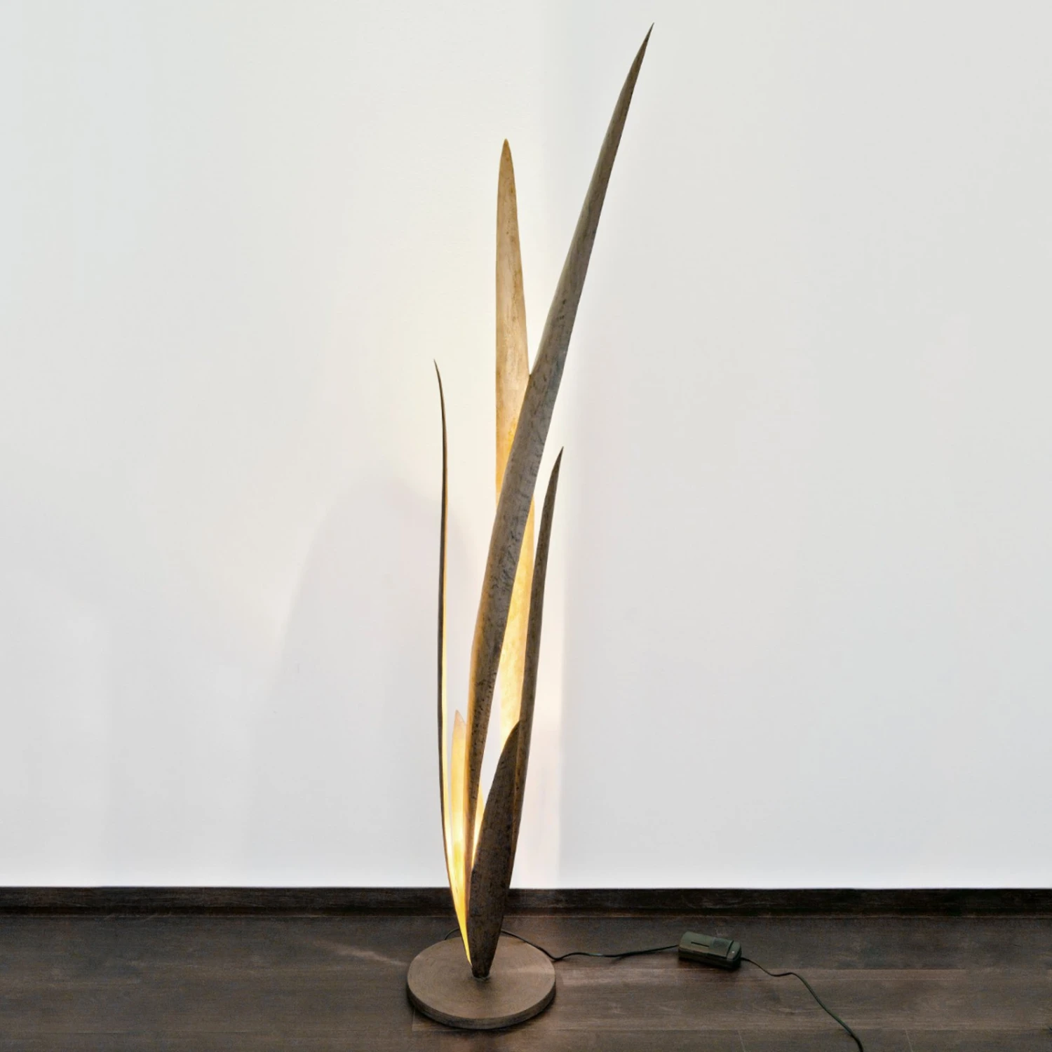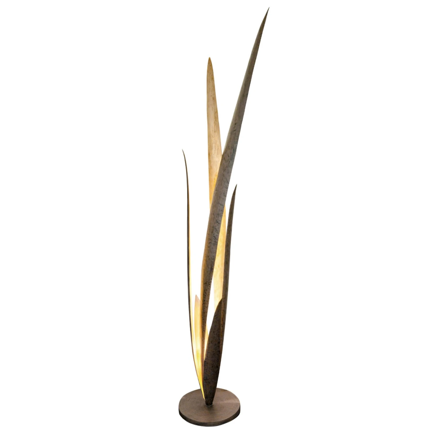 Wie überdimensional große Grashalme wirken die Blätter der Stehleuchte Palustre, die das Leuchtmittel im Innern umgeben. Sie sind unterschiedlich hoch, außen in schöner braun-schwarzer Gestaltung gefertigt und innen in warmem Goldton gearbeitet und winden sich vom runden Fuß aufwärts. Das Leuchtmittel (wahlweise Halogen- oder LED-Lampe mit Fassung GU10) sitzt mittig zwischen den Blättern und strahlt die goldene Innenseite dieser an, was einzigartige Lichtreflexe entstehen lässt. Der Schalter zur komfortablen Bedienung wurde im Zuleitungskabel verbaut.