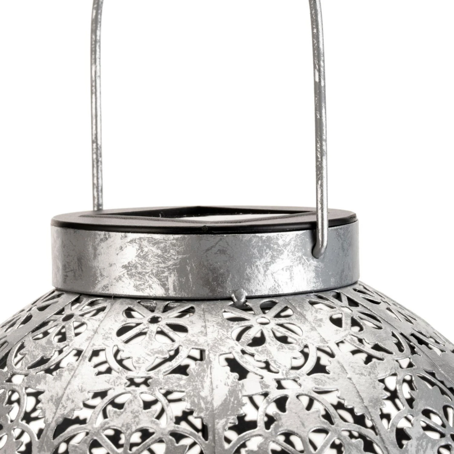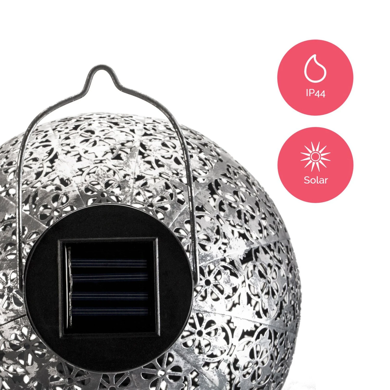 Die moderne Solar-Laterne Sunshine Aura wird aus silbernem Metall gefertigt und sorgt für eine gemütliche Atmosphäre in Garten oder Balkon.