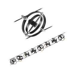 Grenzenlose Gestaltungsmöglichkeiten und eine Montagemöglichkeit an der Decke, einer Dachschräge oder an der Wand bietet das Seilsystem Cardan, das als Komplettset geliefert wird. Die acht Leuchten sind jeweils mit einer GU5,3-Fassung ausgestattet, die von zwei unterschiedlich großen, drehbaren Ringen umgeben wird. Die acht Leuchten können nicht nur am Seil beliebig positioniert werden, sie sind auch dreh- und schwenkbar, so dass sich die einzelnen Leuchten in unterschiedliche Raumbereiche ausrichten lassen und mit dem Seilsystem auch verwinkelte Räume oder lange Flure perfekt ausgeleuchtet werden können. Leuchtmittel werden nicht mitgeliefert.