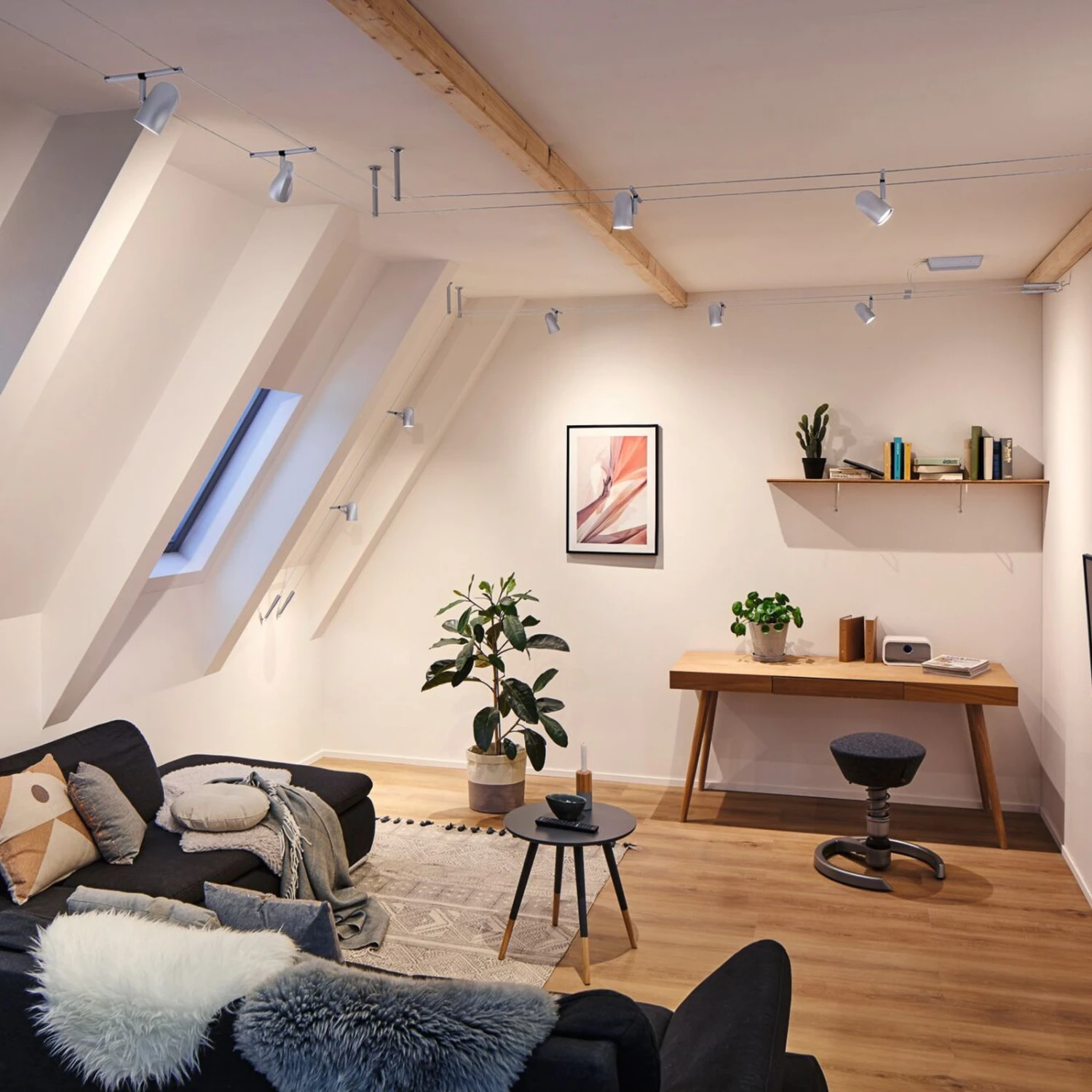 Seilsysteme lassen sich in den unterschiedlichsten Räumen nutzen und bieten ein Höchstmaß an Gestaltungsmöglichkeiten. Das fünfflammige Seilsystem Cup kann an der Decke, an einer Dachschräge und sogar an einer Wand montiert werden und ist damit ein Problemlöser für schwierige Installationsbedingungen. Durch die am Seil flexibel ausrichtbaren Spots und deren Dreh- und Schwenkbarkeit lässt sich die Lichtstrahlung bis in jeden Winkel eines Raumes oder eines langen Flures lenken und es können gezielte Akzente mit Licht gesetzt werden.