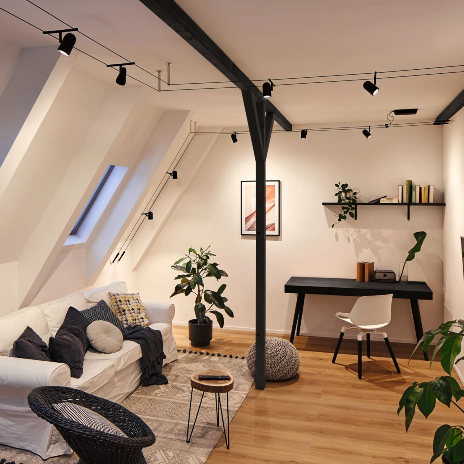 Seilsysteme lassen sich in den unterschiedlichsten Räumen nutzen und bieten ein Höchstmaß an Gestaltungsmöglichkeiten. Das fünfflammige Seilsystem Cup kann an der Decke, an einer Dachschräge und sogar an einer Wand montiert werden und ist damit ein Problemlöser für schwierige Installationsbedingungen. Durch die am Seil flexibel ausrichtbaren Spots und deren Dreh- und Schwenkbarkeit lässt sich die Lichtstrahlung bis in jeden Winkel eines Raumes oder eines langen Flures lenken und es können gezielte Akzente mit Licht gesetzt werden.