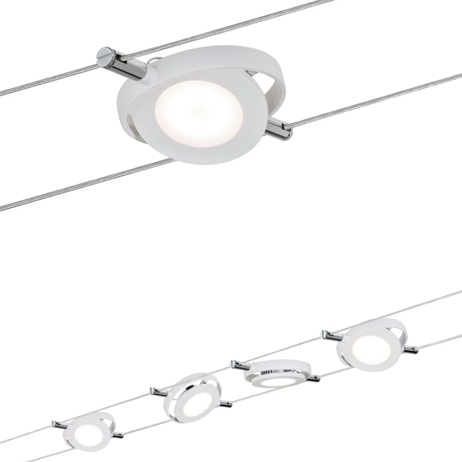 An Flexibilität und Vielseitigkeit lässt sich das Seilsystem RoundMac kaum übertreffen. Das Seilsystem kann gerade, über Eck oder schräg montiert werden, sodass es mit jeglichen räumlichen Gegebenheiten kompatibel ist. Die vier Strahler mit den fest verbauten LEDs in mattem Weiß können geschwenkt und entlang des Seils neu positioniert werden. Das Ganze wird in einem praktischen Komplettset mit Trafo, Seilen, vier Strahlern und Montageanleitung geliefert.