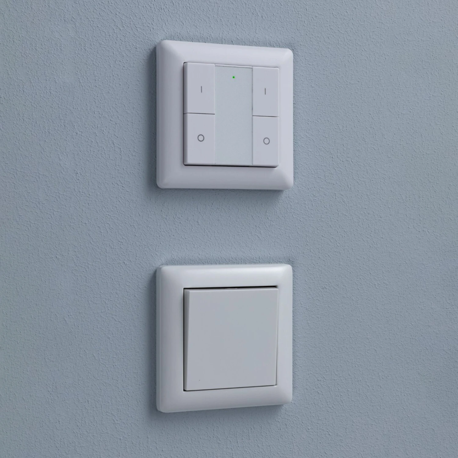 Der mitgelieferte Wandtaster kann ebenfalls zum Schalten und Dimmen verwendet werden. Er lässt sich wahlweise direkt mit den Leuchtmitteln koppeln oder smart einbinden, ist batteriebetrieben und passt in die Rahmen gängiger Markenschalter.