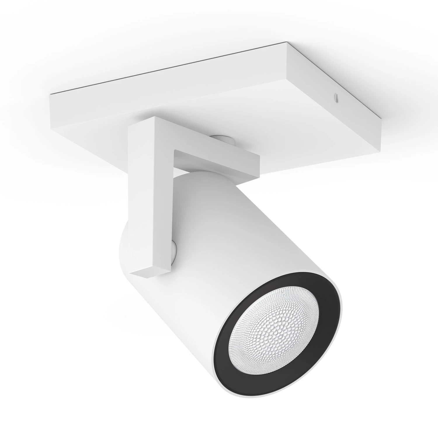 Ein schlichter, funktionaler Aufbau, kombiniert mit smarter Steuerung und vielfältigen Lichtoptionen – das Resultat ist ein absolut moderner Lichtspender. Argenta besteht aus einem zylindrischen Leuchtenkopf, der dreh- und schwenkbar über einen L-förmigen Arm mit dem eckigen Deckenhalter verbunden ist. Im Innern verbirgt sich eine äußerst vielseitige Hue White and Color Ambiance GU10-Lampe.