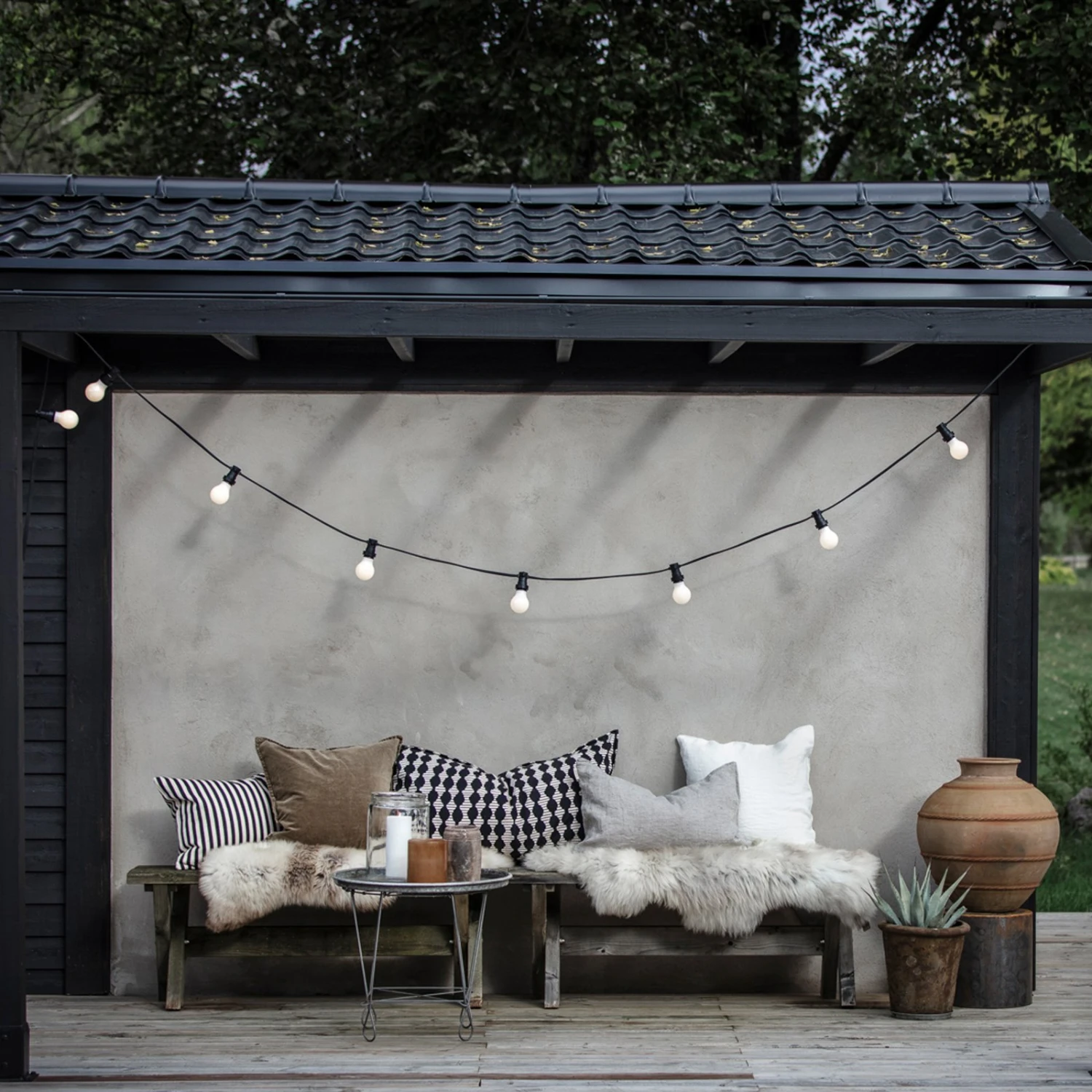 Dank Schutzart IP44 kann die LED-Lichterkette Bright problemlos im Außenbereich genutzt werden. Auf der Terrasse, dem Balkon oder im Gartenbereich sorgt sie mit ihrer warmen Lichtfarbe für angenehme Lichtverhältnisse und ein gemütliches Ambiente. Die Leuchtmittel wurden opal gestaltet, sodass das Licht blendfrei an die Umgebung gestrahlt wird. Bei Bedarf können die Leuchtmittel einfach ausgetauscht werden.
