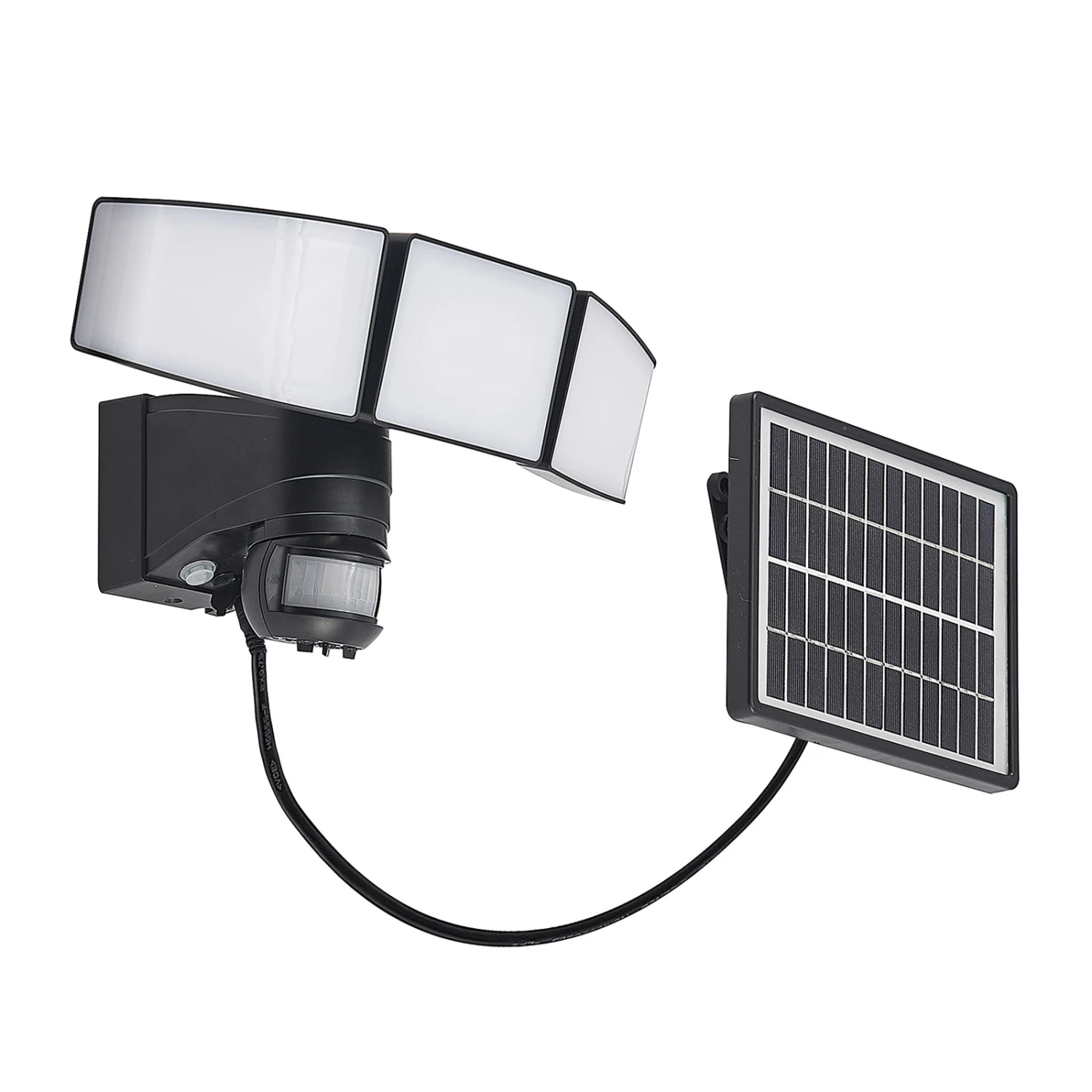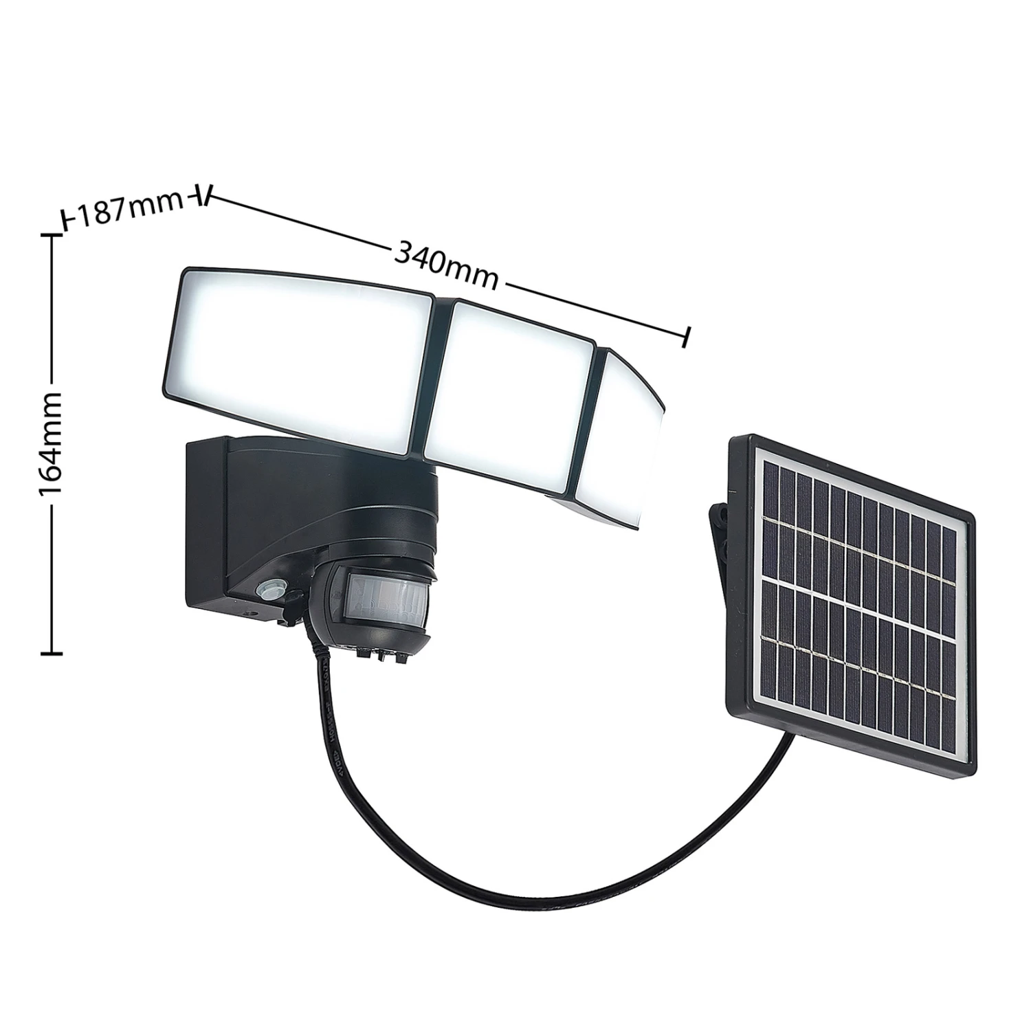 Der LED-Solar-Wandstrahler Kalvito besticht mit seinem modernen Design und der fortschrittlichen Solar-Technik. Er besitzt drei LED-Panele, die sich bei Bedarf flexibel schwenken lassen, sodass der Abstrahlwinkel individuell bestimmt werden kann. Das Tageslicht der LEDs ist besonders praktisch in den Abendstunden und dient einer guten Ausleuchtung im Außenbereich. Der integrierte Bewegungsmelder hat einen Erfassungswinkel von 140° und reagiert in einer Entfernung von maximal 10 Metern. Die Leuchtdauer ist individuell regulierbar zwischen 3 Sekunden und 7 Minuten.