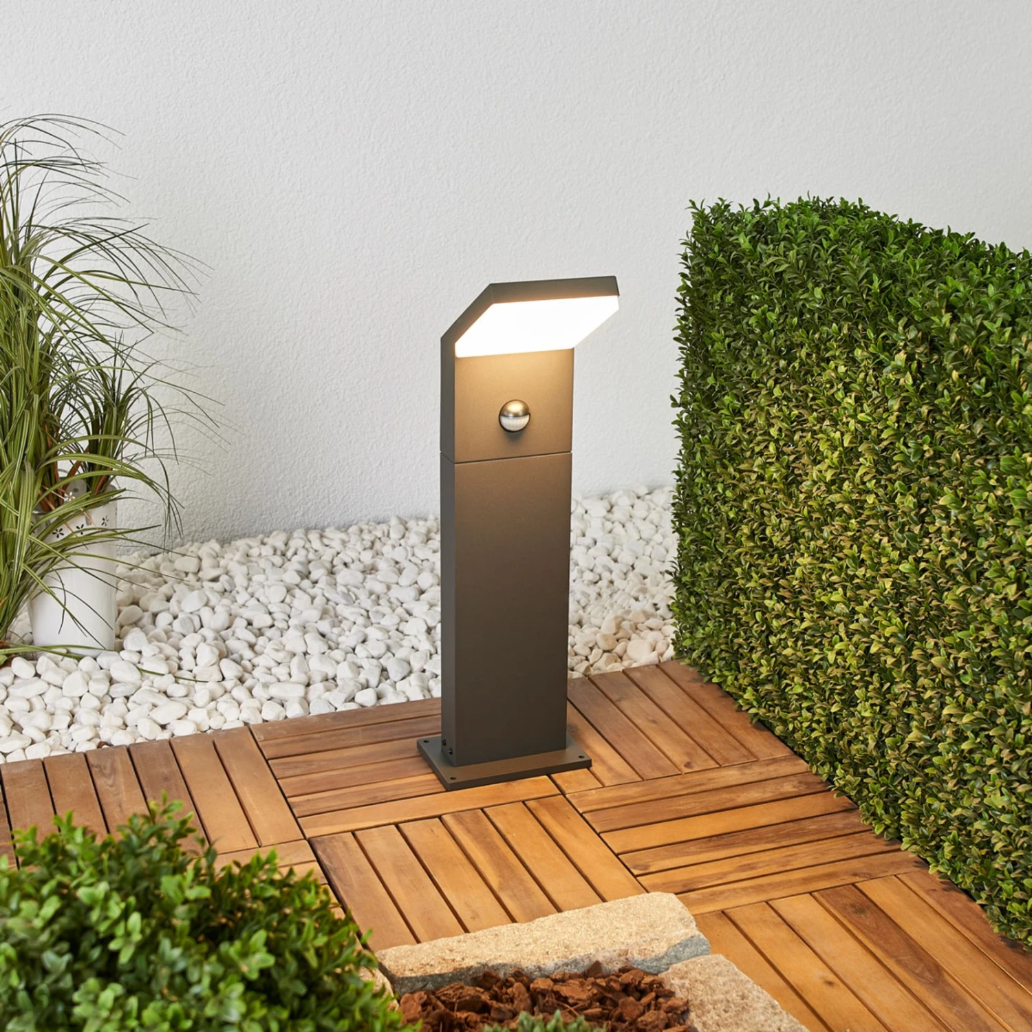Zeitgemäße LED-Wegeleuchte Yolena mit grafitgrauer Oberfläche und integriertem Sensor