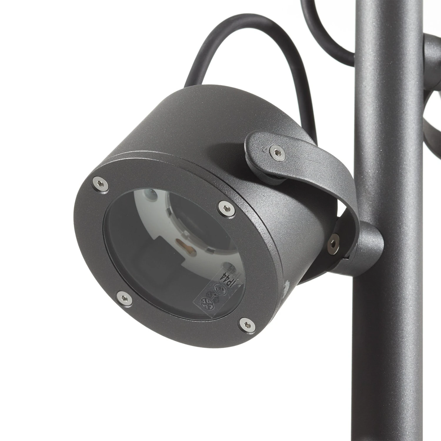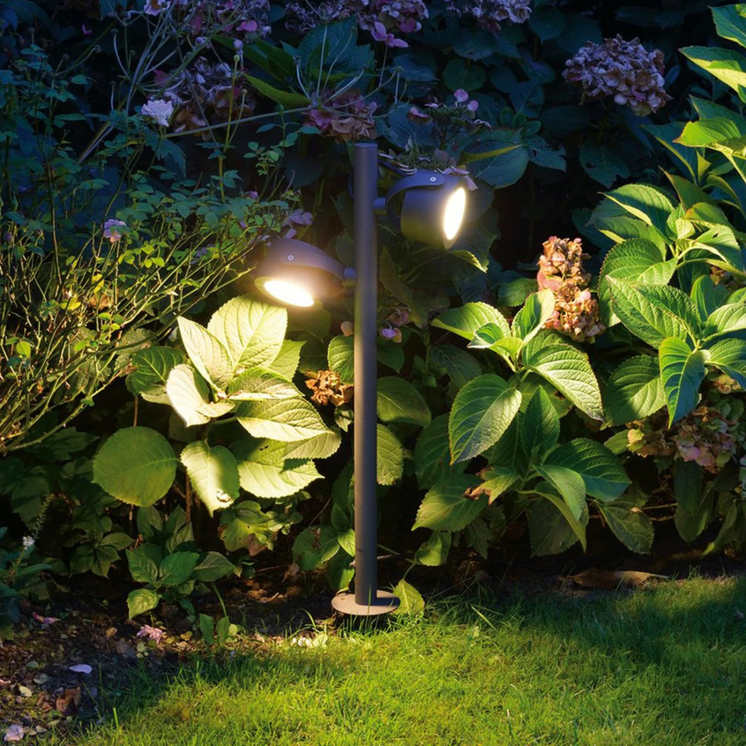 Diese exklusive Wegeleuche wird aus Aluminium produziert, die Leuchtmittel werden durch klare Gläser geschützt. Diese Wegeleuchte passt einerseits sehr gut in ein modernes Beleuchtungsumfeld. Da beide Strahler verstellbar sind, kann man gezielt Objekte anstrahlen und zur Geltung bringen.