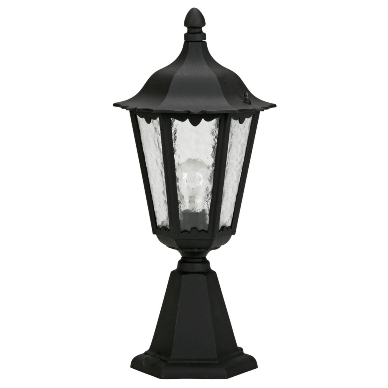 Die Sockelleuchte 0541 eines deutschen Herstellers überzeugt durch erstklassige Verarbeitung und hochwertige Materialien. Die rustikal und in klassischer Laternenform gestaltete Leuchte besteht aus Aluminiumguss mit schwarzem Finish und klarem Kathedralglas. Durch das Klarglas des Schirmes kann das Licht ungehindert in alle Richtungen strahlen und den Außenbereich sicher beleuchten.