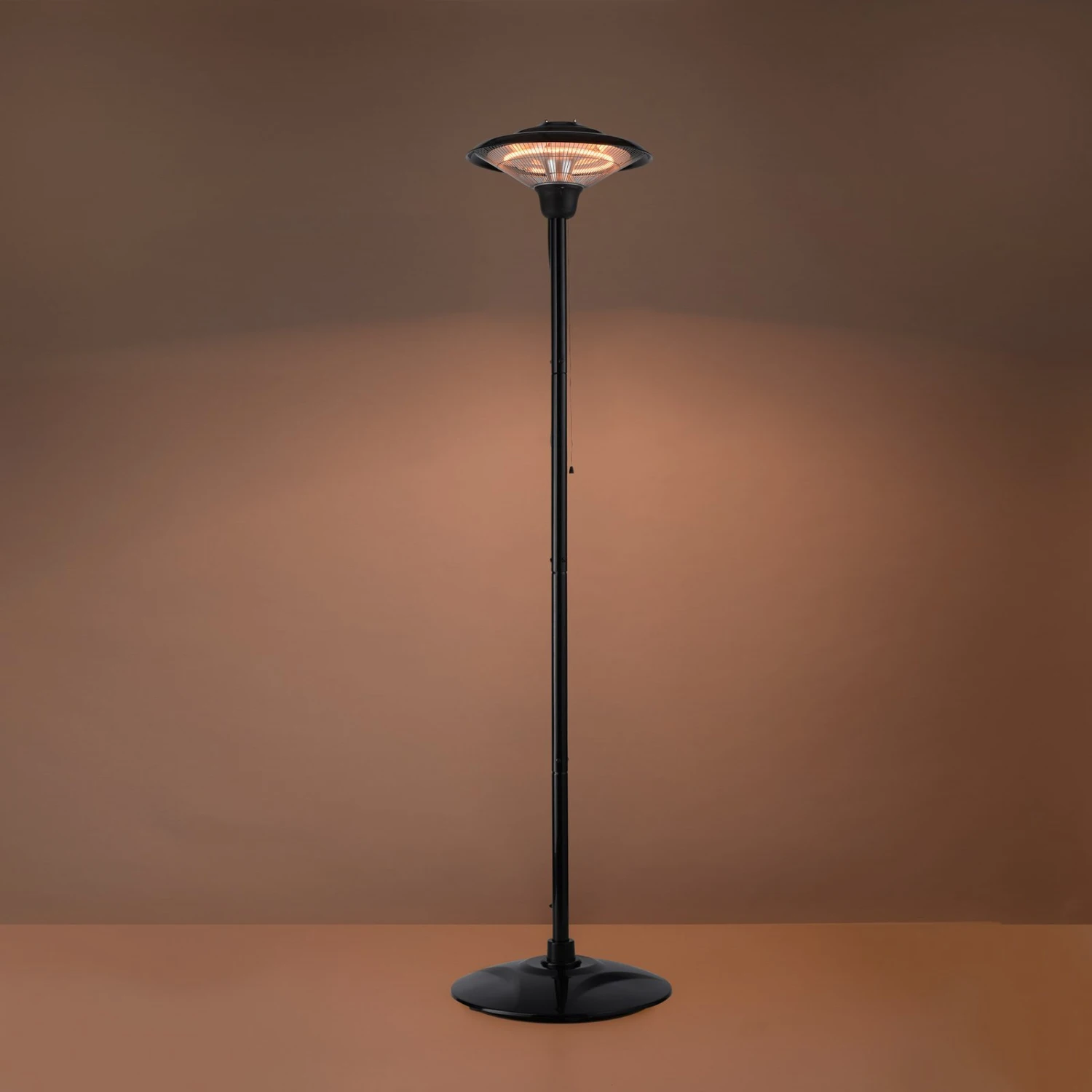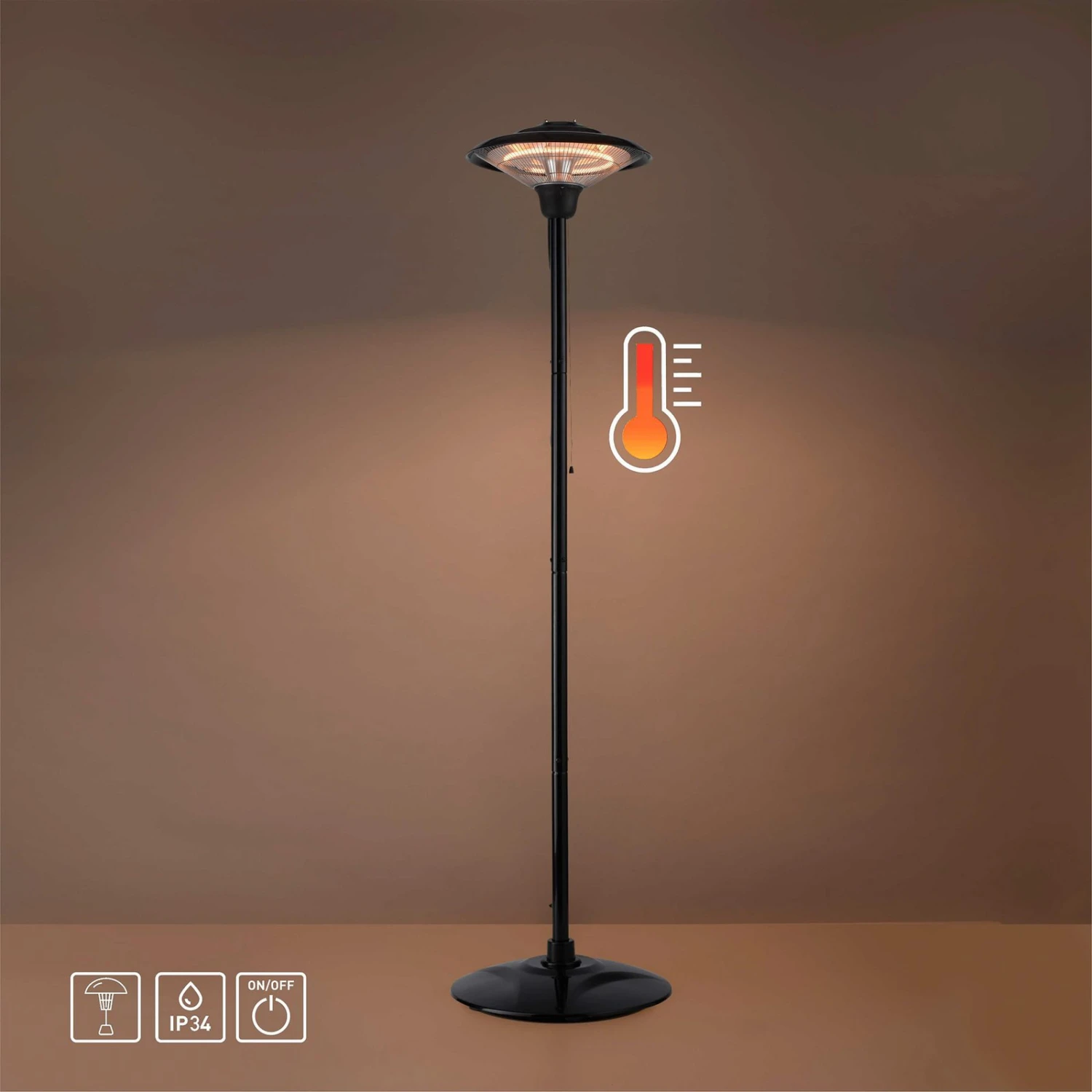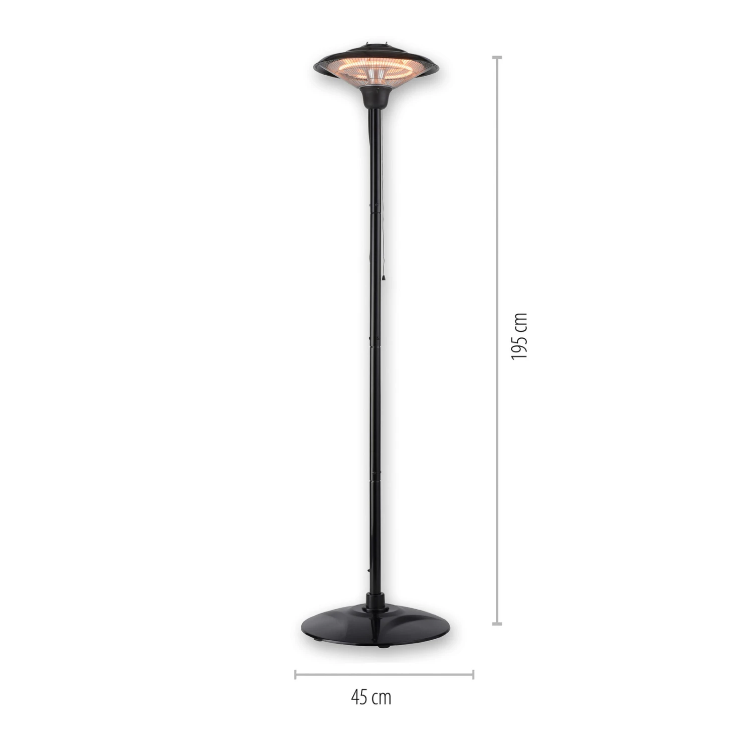 Der elegante Wärmestrahler für Terrasse oder Balkon spendet Licht und Wärme an kühlen Abenden. Dabei ist das zeitlose Design schlicht und unauffällig und findet überall einen Platz. Der breite Standfuß sorgt für einen sicheren Stand. Mithilfe eines Zugschalters kann der Heizstrahler ein- und ausgeschaltet sowie die Heizleistung von 750 Watt zu 1.500 Watt variiert werden.