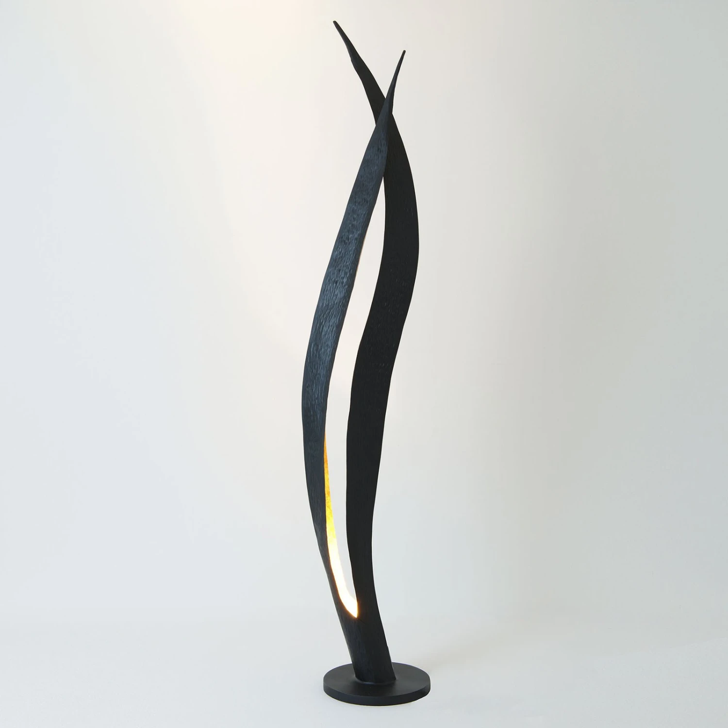 Ein besonderes Leuchtenaccessoire, das zum einen für eine effektvolle, atmosphärische Zusatzbeleuchtung im Wohnzimmer sorgt, und zum anderen auch unbeleuchtet als dekorativer Blickfang dient, stellt die Stehleuchte Barbone dar. Vom schlichten Fuß aus erstrecken sich – in der Form exotischen Blättern ähnlich – zwei Elemente nach oben in den Raum, die von außen schwarz-braun und von innen goldfarben gehämmert sind. Direkt über der Bodenplatte ist mittig eine GU10-Fassung verbaut, die mit einer passenden Lampe nach Wahl bestückt werden kann (siehe Zubehör). Das Licht der eingesetzten Lampe bringt die Schönheit von Barbone dann voll zur Geltung, in Kombination mit dem Goldton wird eine glanzvolle, behagliche Lichtstimmung erzeugt.