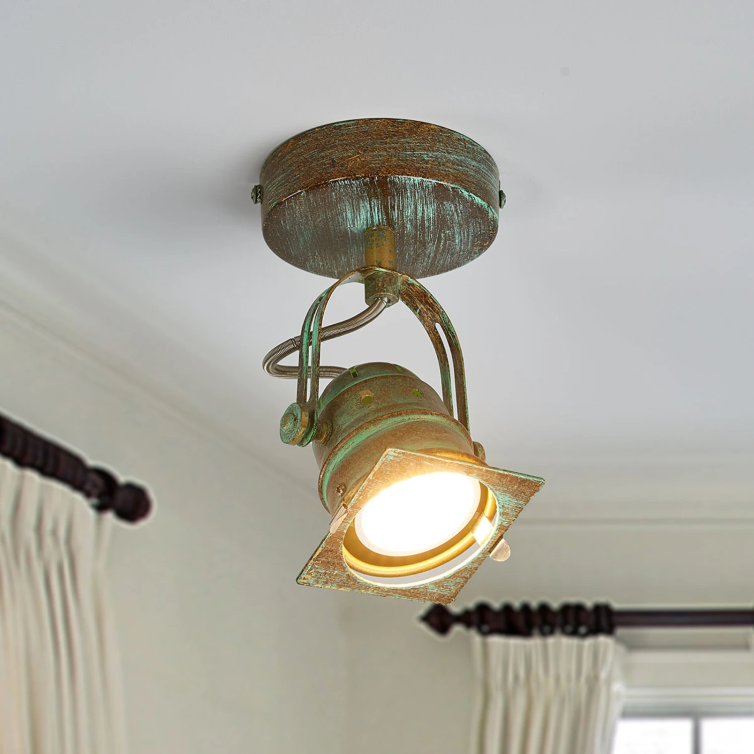 Janek ist nicht ausschließlich für die Wandmontage gedacht, sondern kann ebenso gut als Strahler für die Decke genutzt werden. Egal, für welche Anbringungsart man sich entscheidet, in beiden Fällen bleibt die antike, nostalgische Wirkung des Strahlers erhalten, denn das Oberflächenfinish in Grünspanoptik erweckt den Eindruck, als ob man bereits die Spuren der Zeit erkennen könnte, was natürlich einen besonderen Reiz besitzt.
