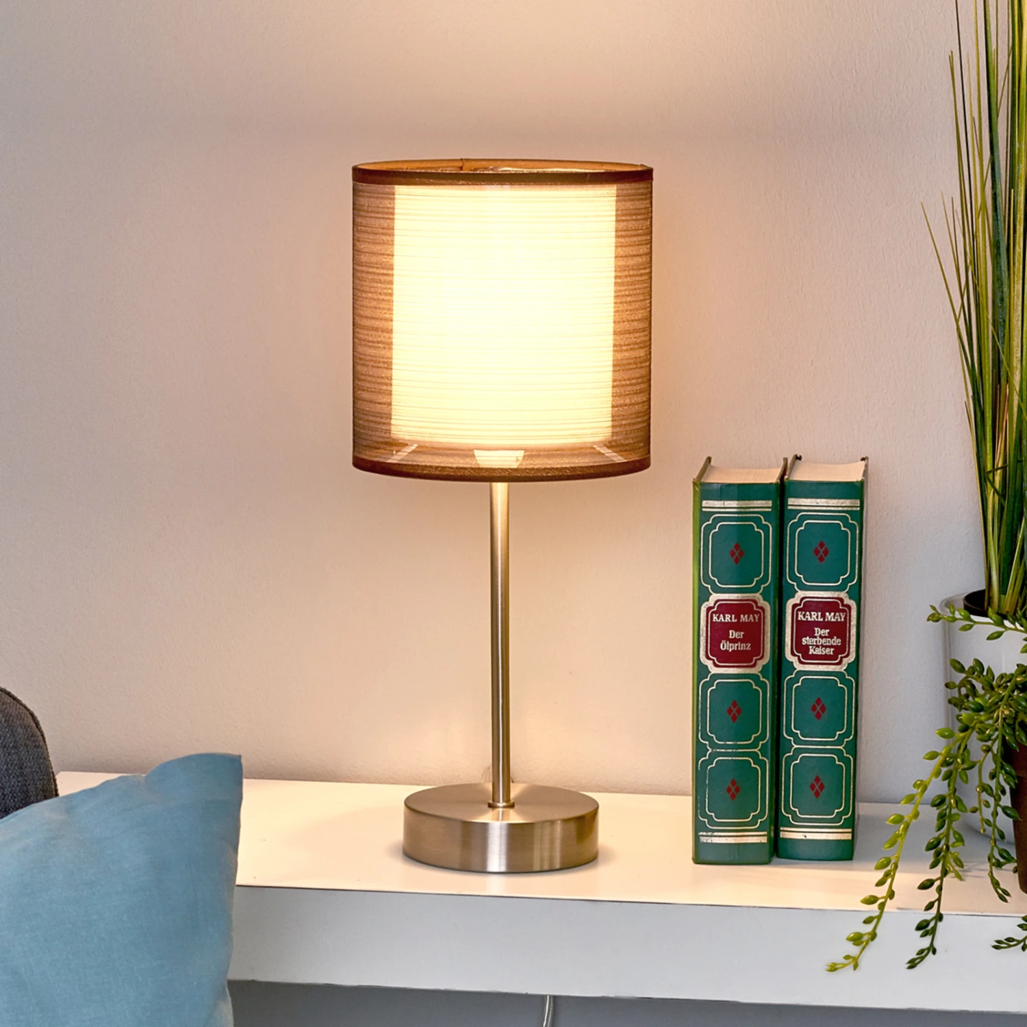 Diese Tischlampe ist für den Nachttisch gedacht, kann aber natürlich auch an anderen Orten in der Wohnung aufgestellt werden, zum Beispiel auf einer Fensterbank, einer Kommode oder einem Beistelltisch. Alle Orte haben gemeinsam, dass sie in ein schönes, behagliches Licht getaucht werden, wenn man die Nachttischlampe Nica einschaltet. Der äußere Schirm ist braun und sehr durchlässig, der innere weiß und dicht gewebt.