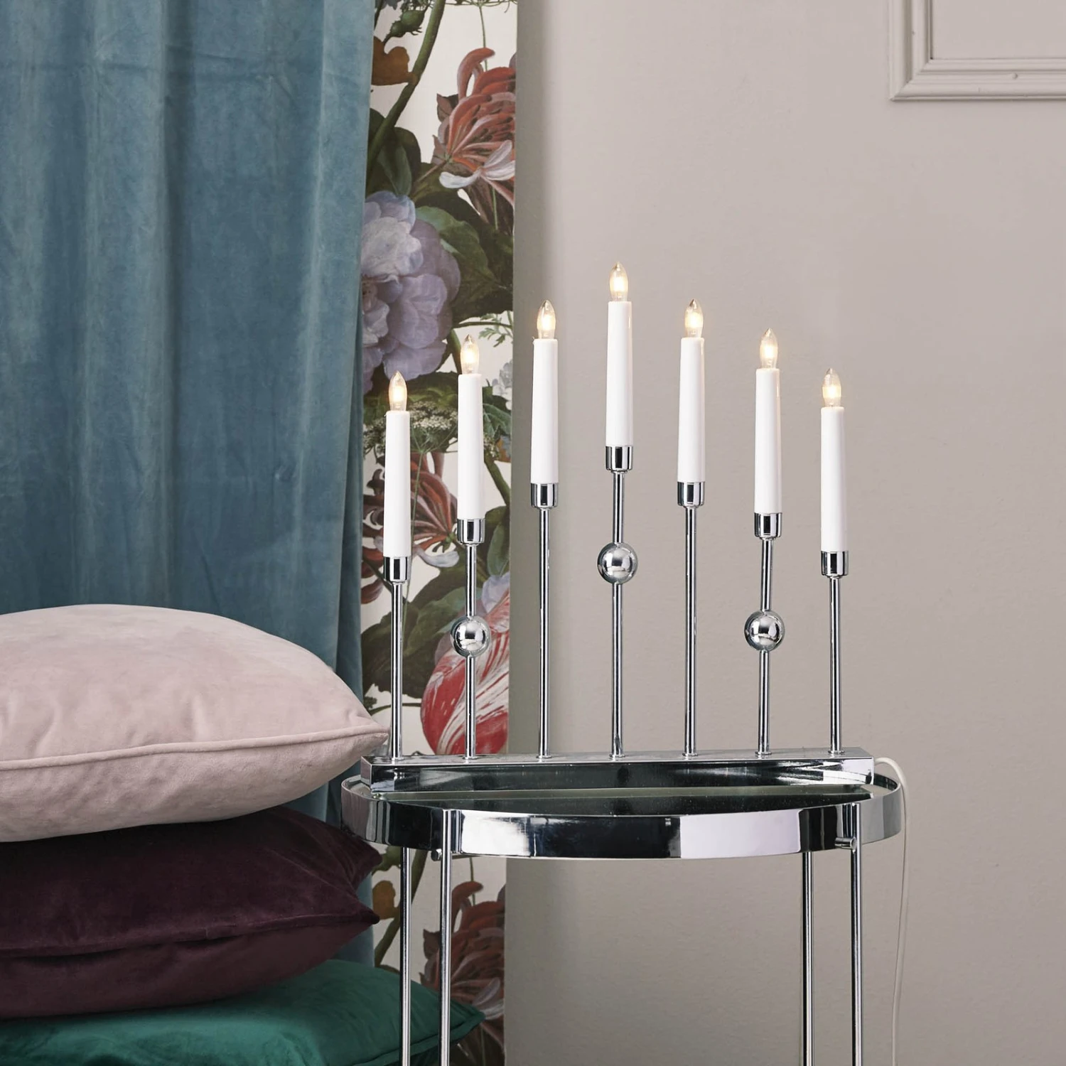 Wunderschön wirkt dieser siebenflammige Kerzenleuchter aus Metall mit glanzvoller Verchromung: Gustavo ist mit sieben Kerzenleuchten bestückt, die Leuchtmittel sind bereits enthalten. Ein tolles Dekoaccessoire, das nicht nur zur Weihnachtszeit die festliche Akzentbeleuchtung übernimmt. Ersatz-Leuchtmittel können über das Zubehör extra bestellt werden.