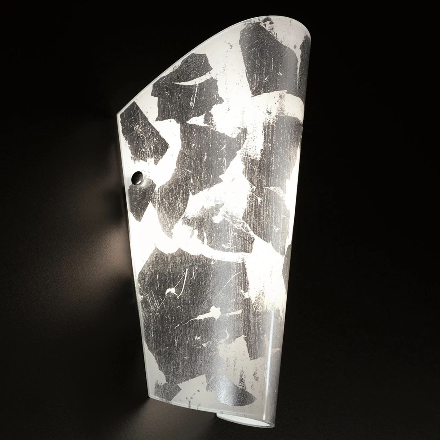 Edle Blattsilber-Stücke zieren den sanft gebogenen Glasschirm dieser Wandleuchte, die dadurch zum unübersehbaren Blickfang an der Wand wird. Durch die beiden Öffnungen auf der Ober- und Unterseite zeichnen sich in eingeschaltetem Zustand wunderschöne Lichtkegel an der Wand ab, so dass diese effektvoll inszeniert wird. Zusätzlich zu den beiden Lichtöffnungen strahlt das Licht jedoch auch durch den satinierten Glasschirm aus, was eine diffuse und sanfte Umgebungsbeleuchtung zur Folge hat.