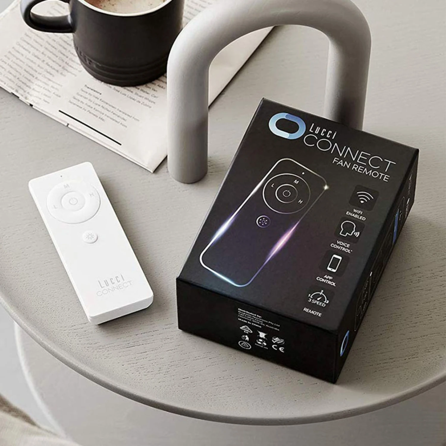 Mit der Fernbedienung Lucci Connect können kompatible Ventilatoren, die mit einer Fernsteuerung nachrüstbar sind, über das WiFi eingebunden und in der Folge via App von jedem beliebigen Ort aus bedient werden.
