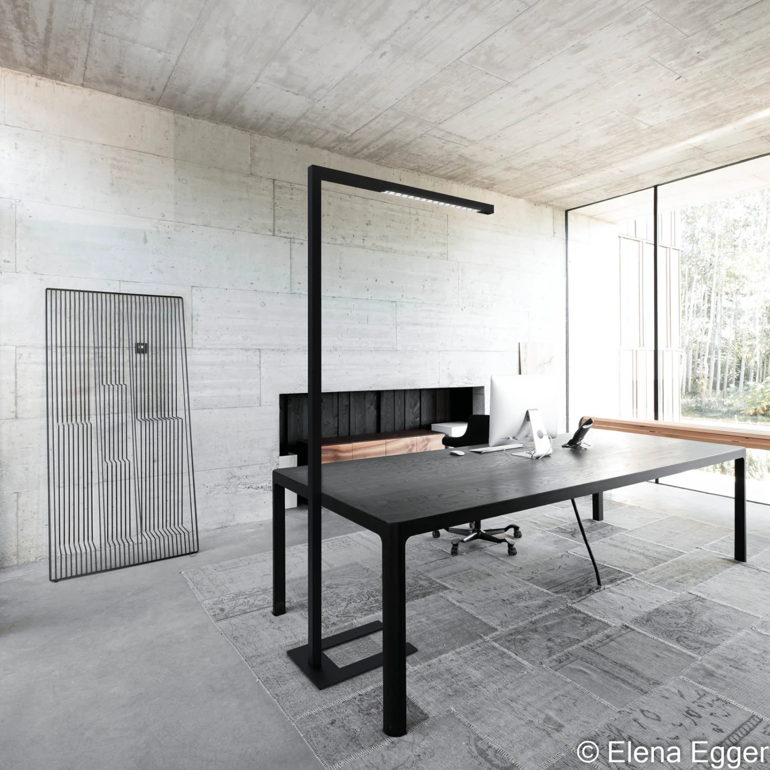 Ein schlankes, kantiges Aluminiumstrangpressprofil mit senkrechtem Gestell und waagrechtem Kopf bildet den Korpus der LED-Stehleuchte Beto; hinzu kommt ein flacher U-Fuß, um die Stehleuchte direkt an einem Tischfuß platzieren zu können.