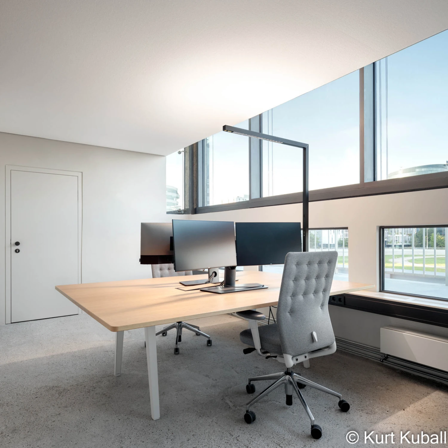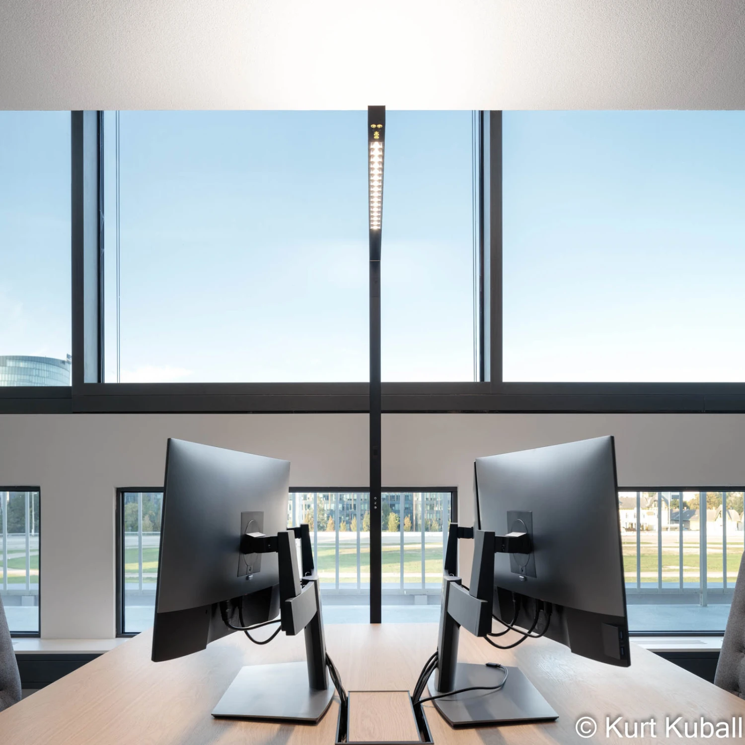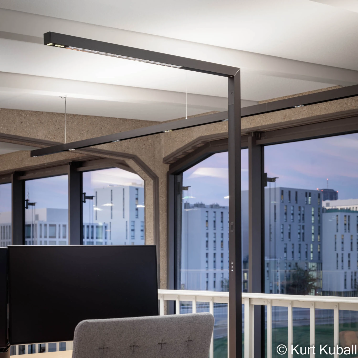 Die Stehleuchte ist zur Grund- und Arbeitsbeleuchtung in modernen Büroräumen konzipiert. Sie verfügt über getrennte LED-Lichtquellen für Up- und Downlight, die sich separat steuern lassen. Nach oben wird durch eine hochwertige Linsenoptik eine maximale, homogene Deckenaufhellung erzielt, während das direkte Arbeitslicht durch einen verchromten Reflektor mit Facettenoptik asymmetrisch und mit geringer Blendwirkung ist.