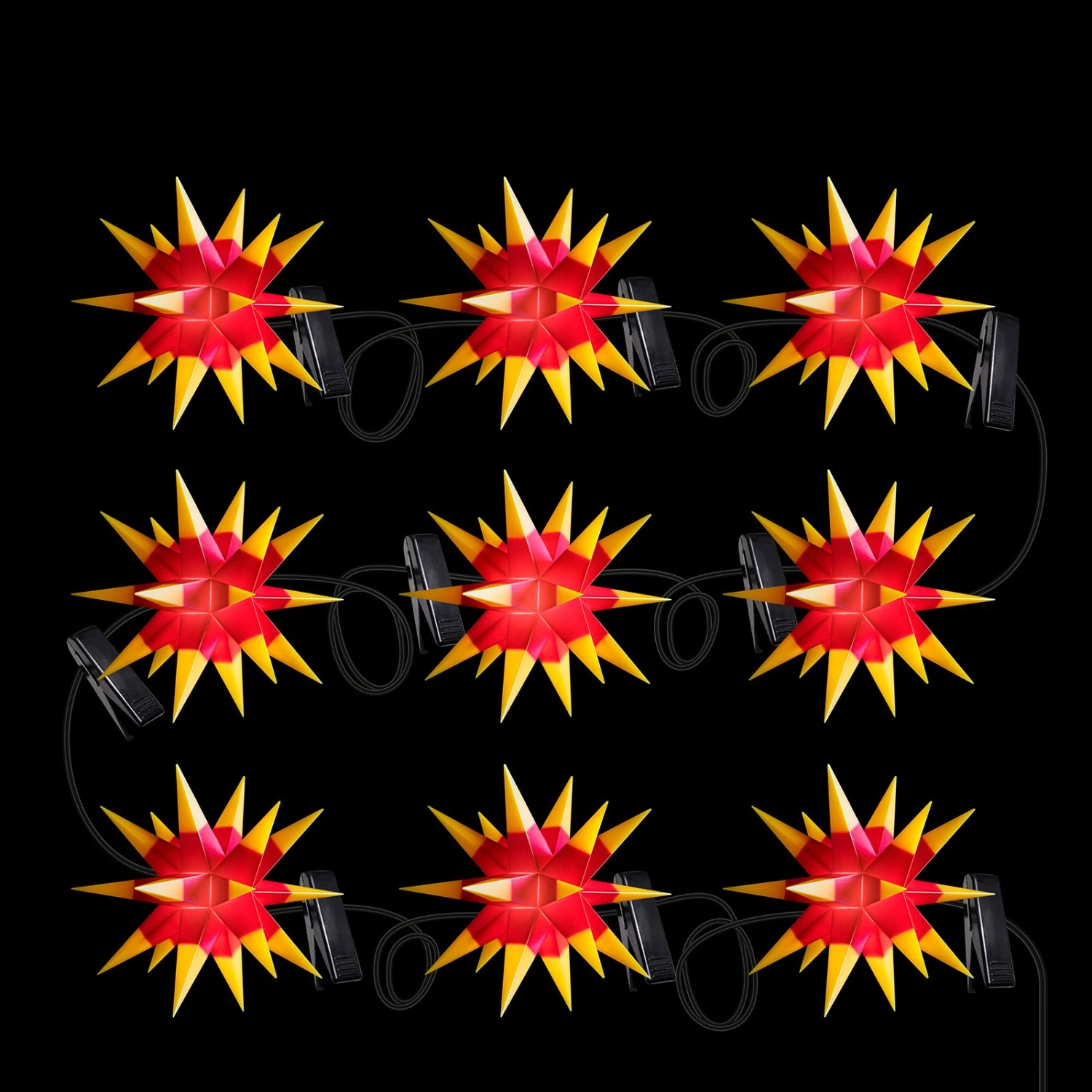 Rote 18-Zacker mit gelben Spitzen, die der Sternen-Schönheit einen besonderen Effekt verleihen, reihen sich im Abstand von 100 cm auf dieser für innen und außen geeigneten Lichterkette aneinander. Die Sterne wurden aus Kunststoff gearbeitet, dem auch Frost und Regen nichts anhaben können. Ausgeschaltet bestechen die Sterne schon durch ihre besondere Form. Sobald die Beleuchtung angeschaltet wird, lässt warmweißes Licht die Sterne in besonderem Glanz erstrahlen. Mit schwarzem Kabel bestückt. Klammern für die Befestigung der Lichterkette, z. B. an einem Baum oder einer Girlande, sind bereits in der Lieferung enthalten. Auch ein Außen-Transformator wird mitgeliefert.